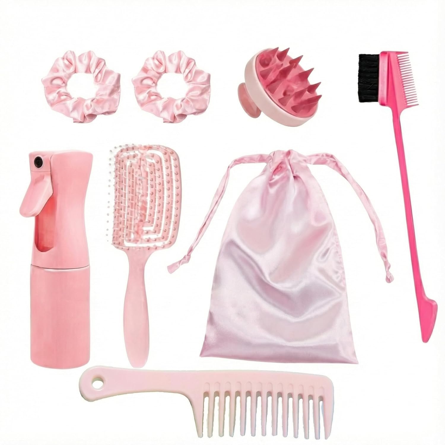 7pcs Hair Essentials Set: Spray Bottle, Detangling Brush, Scalp Massager, Brow & Lash Grooming Tool, Styling Comb, and Fabric Hair Tie – For All Ages and Relaxation at Home